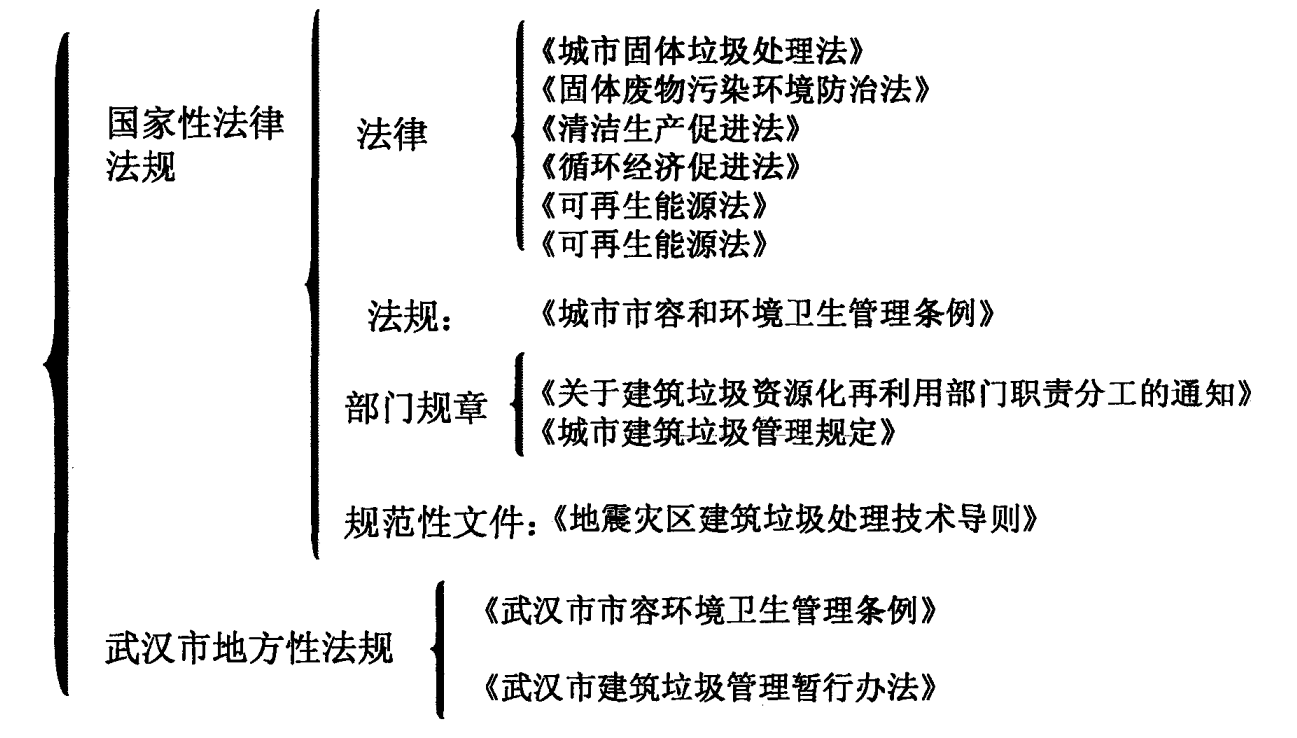 根據(jù)國務(wù)院、建設(shè)部頒布的一系列建筑垃圾管理相關(guān)法,武漢市政府出臺(tái)的相關(guān)建筑垃圾管理的法律法規(guī)有:2005年1月湖北省十屆人大常委會(huì)第13次會(huì)議批準(zhǔn)的《武漢市市容環(huán)境衛(wèi)生管理?xiàng)l例》和2011年4月武漢市人民政府審議通過的《武漢市建筑垃圾管理暫行辦法》。